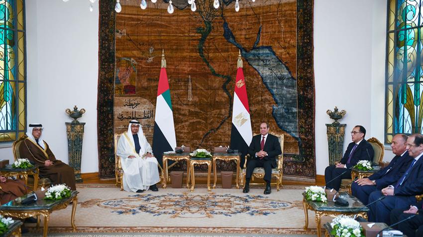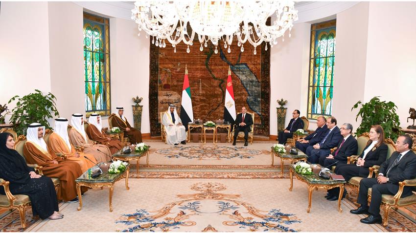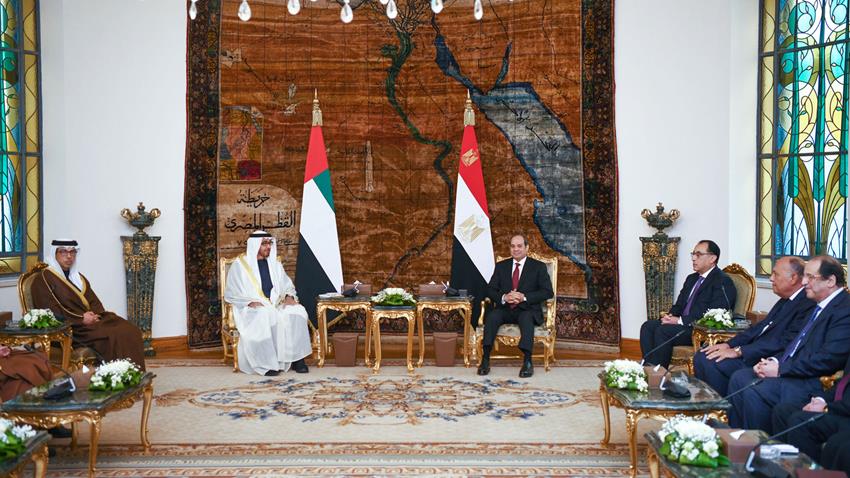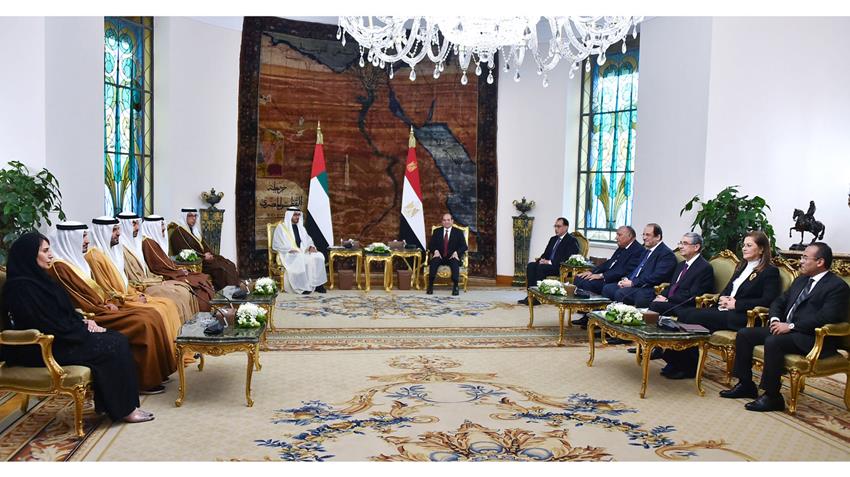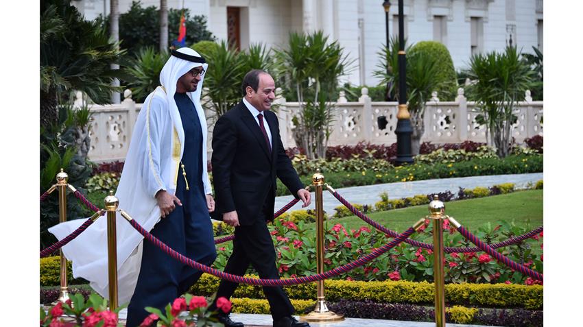 وصرح المستشار أحمد فهمي، المتحدث الرسمي باسم رئاسة الجمهورية، أن السيد الرئيس رحب بأخيه، ضيف مصر العزيز، الشيخ محمد بن زايد، مؤكدًا اعتزاز مصر، حكومة وشعبًا، بالعلاقات بين البلدين الشقيقين، وما يربطهما من أواصر تاريخية وثيقة. ومن جانبه، أعرب رئيس دولة الإمارات عن تقدير بلاده لمصر وشعبها وقيادتها، وحرص الإمارات الدائم على تعزيز علاقات التعاون الأخوية المتميزة بين البلدين.