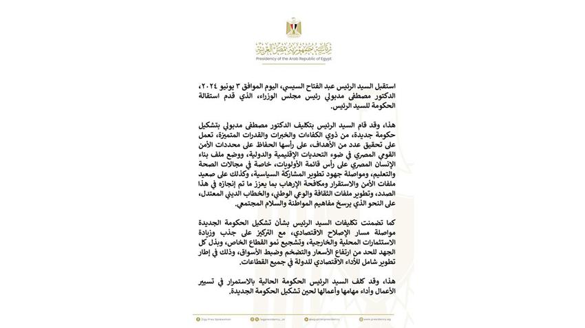 استقبل السيد الرئيس عبد الفتاح السيسي، اليوم الموافق ٣ يونيو ٢٠٢٤، الدكتور مصطفى مدبولي رئيس مجلس الوزراء، الذي قدم استقالة الحكومة للسيد الرئيس.